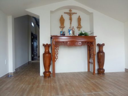 Tầng 2 là khu vực sinh hoạt riêng tư của gia đình có phòng khách, bếp ăn, 2 phòng ngủ khép kín có nhà vệ sinh riêng, 1 phòng ngủ thường, có khu giặt phơi và 1 nhà vệ sinh chung. Ngoài ra còn có 1 ban công sân thượng rộng được bố trí trồng cây tiểu cảnh và 1 bức tượng thờ chúa, ban công được thiết kế mái che và đây là không gian lý tưởng ngồi uống trà hoặc cà phê thư giãn.
