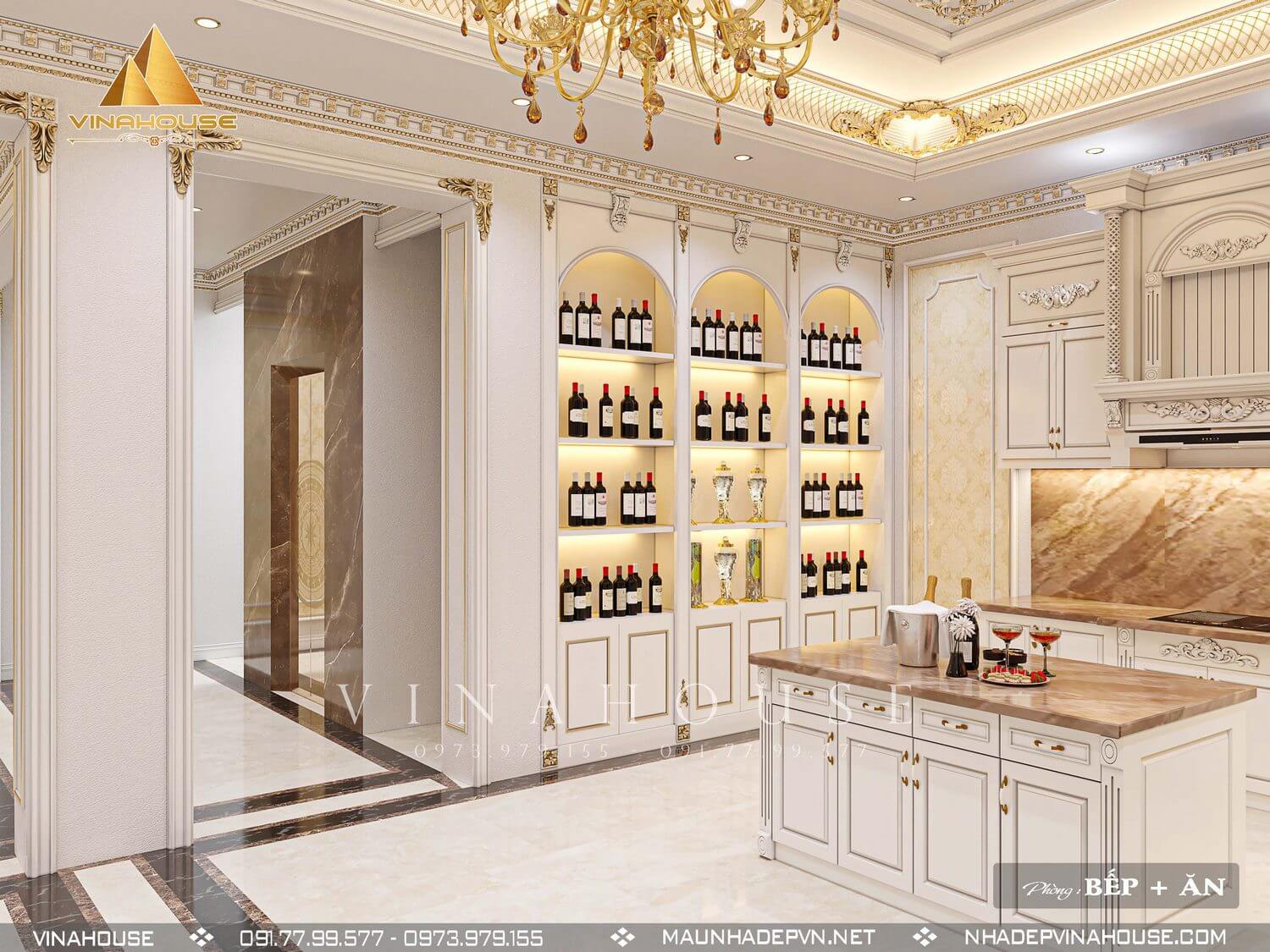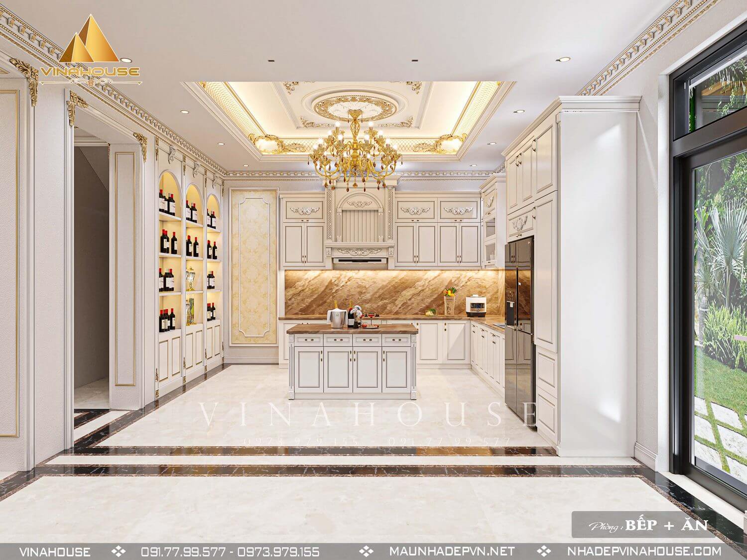 Ánh sáng từ đèn chùm tinh xảo và các đèn chiếu sáng được bố trí khéo léo, làm nổi bật các chi tiết nội thất và tạo ra một bầu không khí ấm cúng nhưng vẫn giữ được vẻ trang trọng. Toàn bộ thiết kế không chỉ làm cho bếp trở thành một không gian chức năng mà còn là một điểm nhấn nổi bật của phong cách hoàng gia trong ngôi nhà.