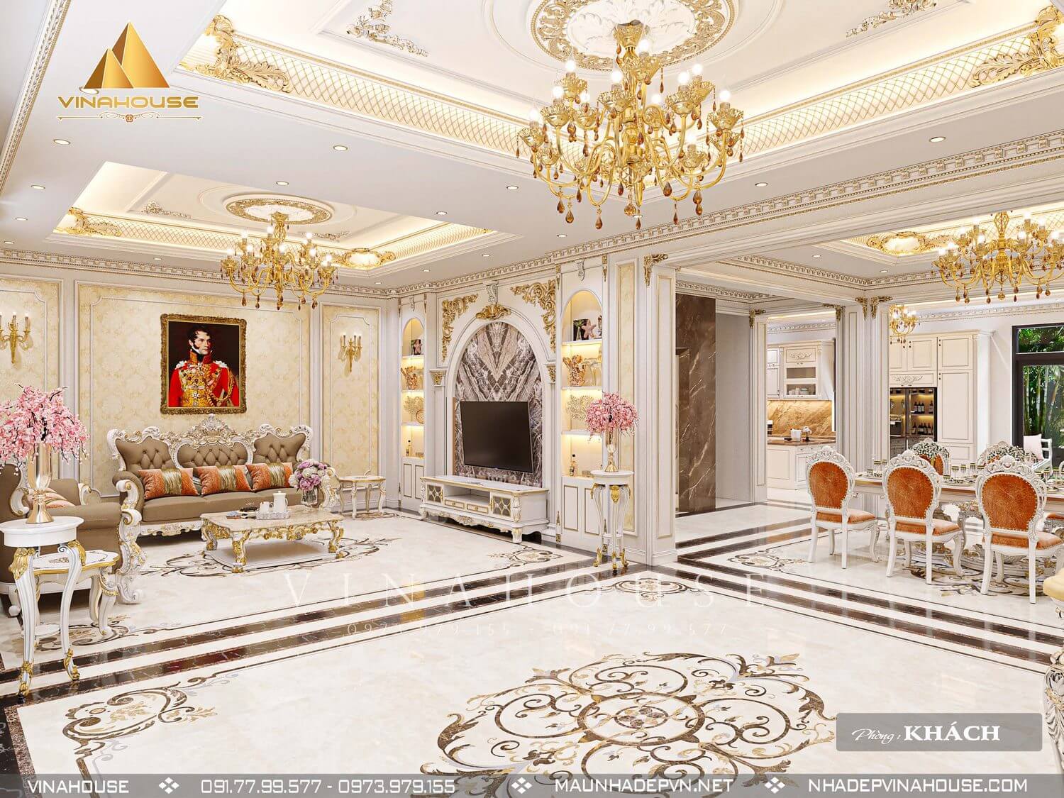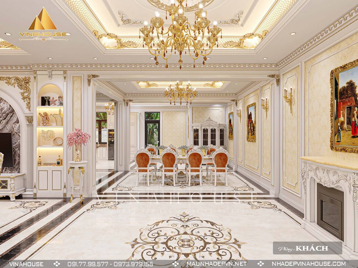 Phòng khách được thiết kế theo phong cách cổ điển với nội thất mang hơi hướng hoàng gia, tạo nên một không gian đầy vẻ đẹp đẳng cấp và trang trọng. Từng chi tiết trong phòng đều được chăm chút tỉ mỉ, từ những bộ ghế bọc nhung sang trọng đến các chi tiết chạm khắc tinh xảo trên đồ gỗ, tất cả đều hòa quyện để mang lại cảm giác quý phái và ấm cúng. Vẻ đẹp cổ điển này không chỉ tạo ấn tượng mạnh mẽ mà còn thể hiện sự tinh tế và sang trọng của không gian sống.