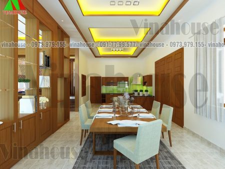 Bên trong biệt thự đẹp được bố trí phòng khách nằm ở sảnh chính đi vào, sau phòng khách là phòng thờ cao hơn 3 bậc tam cấp, phòng bếp ăn nằm ở bên sảnh phụ, bên ngoài bếp ăn là hồ nuôi cá cảnh dọc theo góc chữ L tạo không gian cho phòng ăn thêm sinh động.