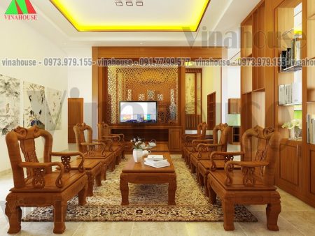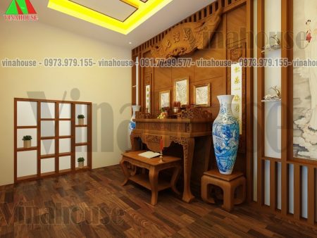 Phòng thờ bố trí cao hơn mặt nền 3 bậc tam cấp nằm sau phòng khách