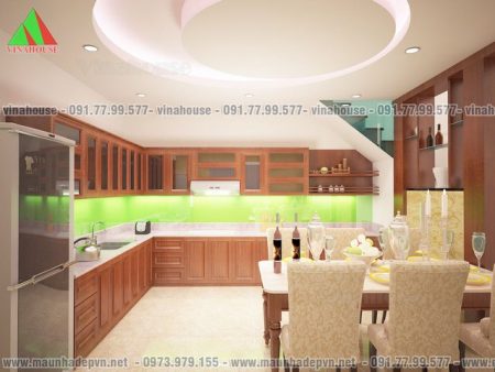 Vách ngăn cầu thang và bếp ăn cũng bố trí để rượu và các đồ trang trí làm phòng ăn và phòng khách thêm sang trọng.