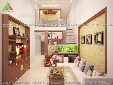 Các không gian bên trong rất dễ cho các gia đình trang trí theo phong cách và cá tính của mình. Vách tủ tivi được thiết kế âm tường 100cm, còn vách trang trí đối diện cũng tương tự rất phù hợp cho treo tranh hoặc dán các bức tranh nghệ thuật. ở cầu thang có góc để bài trí bàn thờ ông địa và bể cá cảnh trang trí đẹp mắt nếu gia đình yêu thích.