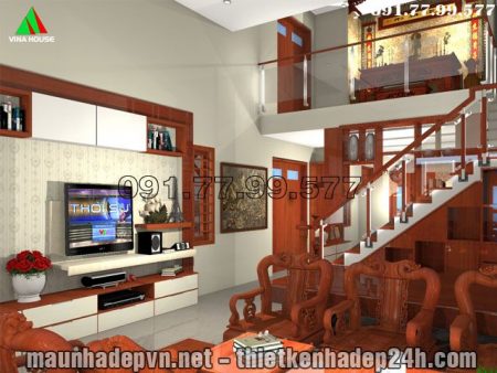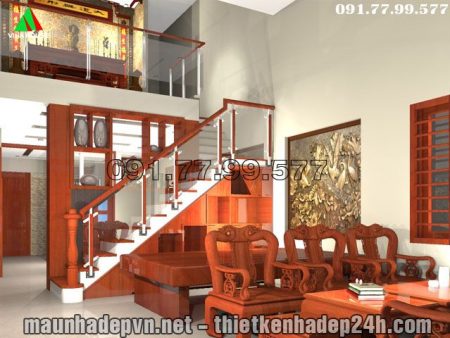 Góc view cầu thang, vách trang trí, bộ bàn ghế và tấm phản phòng khách
