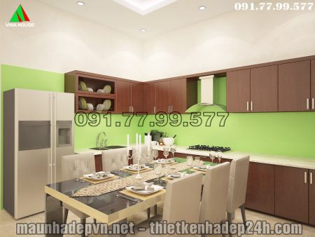 Phòng bếp được thiết kế ngăn nắp đơn giản nhưng đầy đủ tiện nghi cho chị nhà nấu nướng, được bài trí 1 bộ bàn ăn có thể chứa được 6-8 người. Khi thiết kế bếp thì theo kinh nghiệm của chúng tôi không nên thiết kế rườm rà nhiều chi tiết mà quan trọng nhất là tiện nghi cho việc nấu nướng và để dụng cụ nấu ăn… Thì khu bếp sẽ luôn sạch sẽ và dễ vệ sinh sau khi nấu nướng.