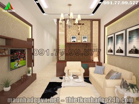 Do tính năng nhà phố nhỏ hẹp nên gia đình quyết định trừ lại 3,4m làm sân để xe máy, còn lại 16,6m làm nhà và phía sau nhà là đất thoát hiểm nên được tận dụng mở cửa sổ và sân giặt phơi. Do đặc tính nhà thờ chúa nên bàn thờ chúa được kết hợp với phòng khách ở vách ngăn cầu thang. Vách trang trí phòng khách được thiết kế âm tường ốp viền gỗ và gắn đèn led cho phòng khách thêm sinh động và nổi bật, Vách tivi được làm đơn giản gọn gàng và logic có thể để đủ các loại đồ lưu niệm cỡ nhỏ và 1 số đồ dùng sách báo vv…