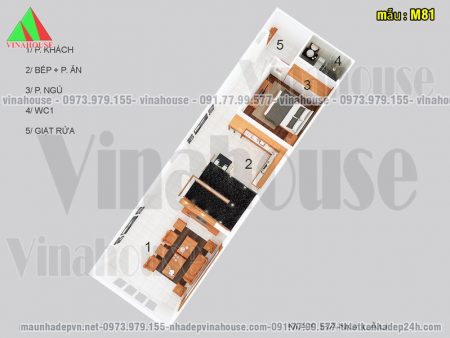Các công năng bố trí bên trong được thiết kế theo phong cách hiện đại và được tính toán đối lưu không khí và ánh sáng hợp lý. Nhà 3 mặt đều kín nên phương án giếng trời được bố trí ở khu vực cầu thang và ở khu vệ sinh cuối nhà để đảm bảo đủ ánh sáng và thông thoáng cho cả nhà vệ sinh và phòng ngủ, Sân trước được trừ lại 3m để làm sân và để xe máy.