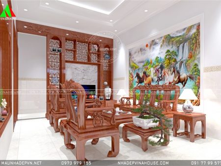 Theo yêu cầu của gia đình thì cần sảnh giải trí lớn để có thể những ngày giỗ hay tiệc tùng có thể làm vài mâm cỗ ở sảnh. Bên trong phòng khách ngăn cách với phòng ăn bằng những ô trang trí thoáng kết hợp tủ rượu.